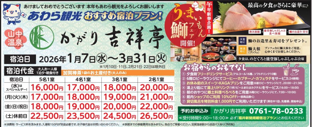 ※お申込みはかがり吉祥亭に直接お願いします。必ず「福井新聞掲載宿泊プランを見ました」とお伝えください。